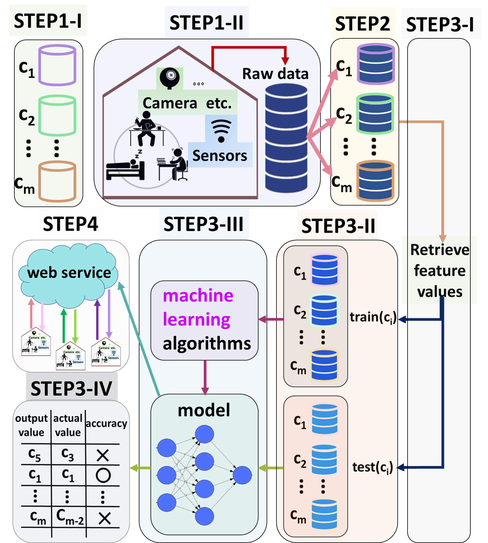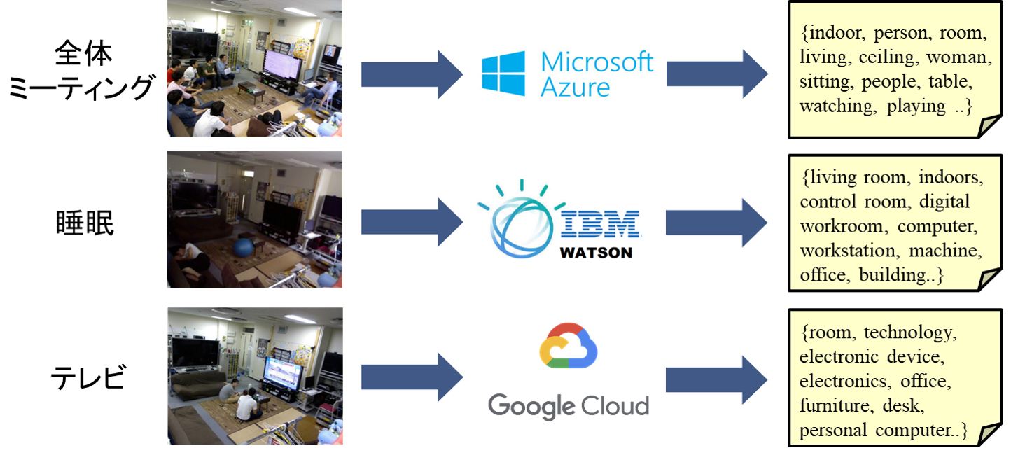 研究の背景†IoT(Internet of Things)技術の急速な発展に伴い,物理空間の様々な情報を収集し,付加価値サービスに活用することが可能になっています.スマートホームの分野では,宅内の居住者や環境についての様々な状況(総じて宅内コンテキストと呼ぶ)を認識する研究が盛んにおこなわれています.宅内コンテキストの例としては,食事をしている,寝ている,テレビを見ている,本を読んでいる等といった居住者の日常生活行動によって定義される状況や,電気が消えている,部屋に誰もいない,部屋が散らかっている等の宅内の環境状態によって定義される状況等が挙げられます. 従来の宅内コンテキスト認識では,建物内あるいは身体に装着されたセンサや,家電から得られる数値データを使うこと主流でした.例えば,家電の消費電力と居住者の位置から日常行動を認識する研究や,スマートフォンのセンサを用いて同様の認識を行う研究が存在する.また,宅内の温度や湿度,照度などの環境変化値の測定から,宅内の環境状態を学習・推定する研究もあります. 現状における課題†近年,深層学習(Deep Learning)の発展によって,画像や音声,動画,テキストなどのマルチメディアデータの学習・認識技術が格段に進歩しています.そのため,我々はマルチメディアデータ(特に画像データ)を活用した新しい宅内コンテキスト認識手法の開発に興味をもって取り組んでいます. 一般的に,画像による機械学習によって宅内コンテキストを認識しようとする場合,世帯ごとの個別の違いが問題となってきます.部屋のレイアウトや存在するオブジェクト,環境の状態は,世帯ごとに異なるため,同じコンテキスト(例えば食事をしている)であっても,画像に映る情報は大きく異なります.また,システムに認識させたいコンテキストも世帯ごとに異なります.よって,世帯ごとに個別の認識モデルを構築する必要があります.単純なアプローチとして,宅内で収集する画像を直接深層学習にかけて,高精度な認識モデルを構築する方法が考えられます.しかしながら,このアプローチは非常に多くの訓練データと強力なマシンパワーを必要とするため,個々の一般家庭で実施するのは現実的ではありません. 研究の目的とアプローチ†本研究では,画像を活用した宅内コンテキスト認識を一般家庭で実施可能にすることを目的とする.そのためのアプローチとして,まず一般家庭における宅内コンテキスト認識のための機械学習フレームワークを提案します.このフレームワークでは,ユーザが自宅で任意のコンテキストを定義し,データを収集し,機械学習を用いて,コンテキストを認識するための汎用的な枠組みを提案します.そして,データの種類や機械学習アルゴリズムは規定せず,深層学習を適用することも可能です. キーアイディア†上記のフレームワークの一実装として,コグニティブAPIによる特徴量を活用した,新たな宅内コンテキスト認識手法を提案します.コグニティブAPIとは,画像や音声等のマルチメディアデータを高度に認識するクラウドサービスのAPI (Application ProgrammingInterface)です.キーアイディアでは,まず宅内で収集した画像を汎用的な画像認識APIに送信し,APIが認識する画像に含まれる情報(タグ集合)を抽出します.次に,抽出した全てのタグ集合に対して,テキストマイニングを行い,各画像をベクトル化します.最後に,これらのベクトルを軽量な教師あり機械学習にかけ,多値分類モデルを構築します.提案手法では,深層学習を利用せずに軽量な機械学習を用いるため,各家庭に特化したコンテキスト認識モデルをはるかに少ないエフォートで実現できます. 発表論文†[1] Sinan Chen, Sachio Saiki, and Masahide Nakamura, ICSPIS2018 Best Paper Award, ``Evaluating Feasibility of Image-Based Cognitive APIs for Home Context Sensing,'' In International Conference on Signal Processing and Information Security (ICSPIS2018), November 2018. (Dubai, UAE) [2] 陳 思楠, 佐伯 幸郎, 中村 匡秀, ``画像に基づくコグニティブAPIの宅内センシングへの適用可能性,'' 電子情報通信学会技術研究報告, vol.118, no.195, SC2018-19, pp.31-36, August 2018. (東京・法政大学) [3] 陳 思楠, 佐伯 幸郎, 中村 匡秀, ``コグニティブAPIによる特徴量を用いた宅内コンテキスト認識手法の提案,'' 電子情報通信学会技術研究報告, vol.118, no.511, SC2018-38, pp.7-12, March 2019. (東京・国立情報学研究所 ) |
