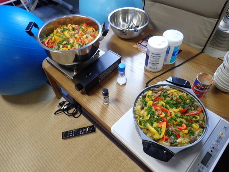 先輩方が本場スペインで入手してきたというパエリアの素を使用し,エビやアサリを使ったシーフードパエリアと,鶏肉や牛肉を使った肉パエリアの2つを作りました.