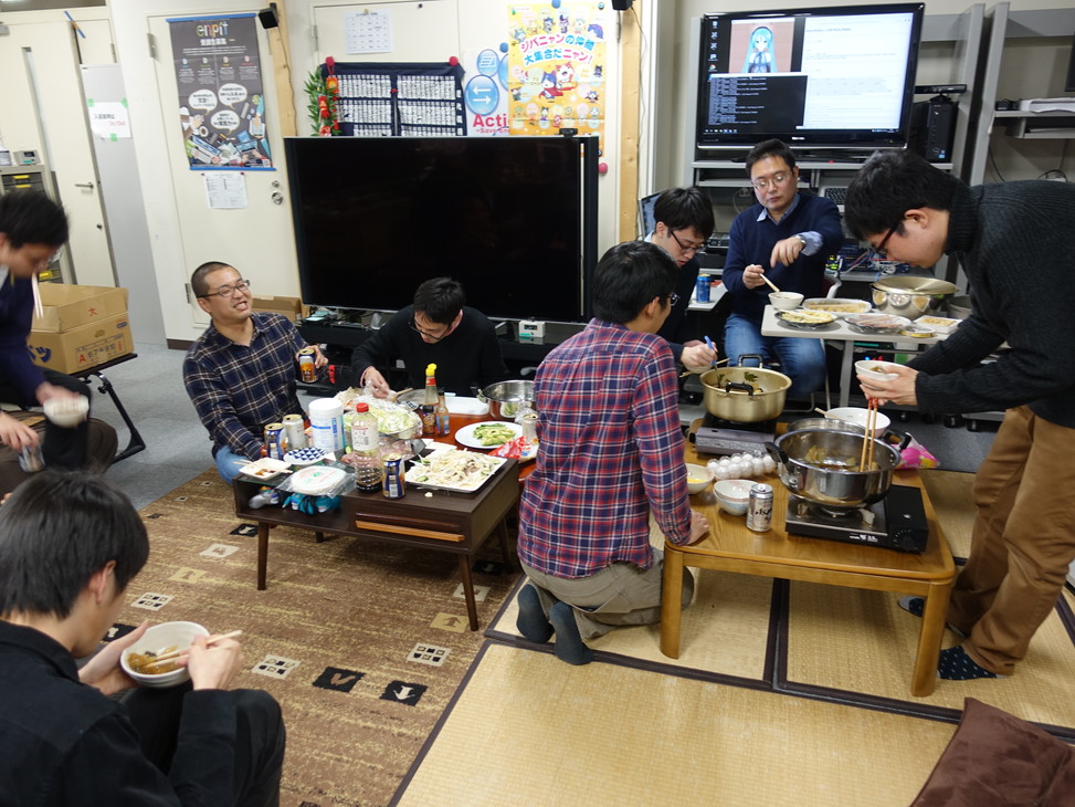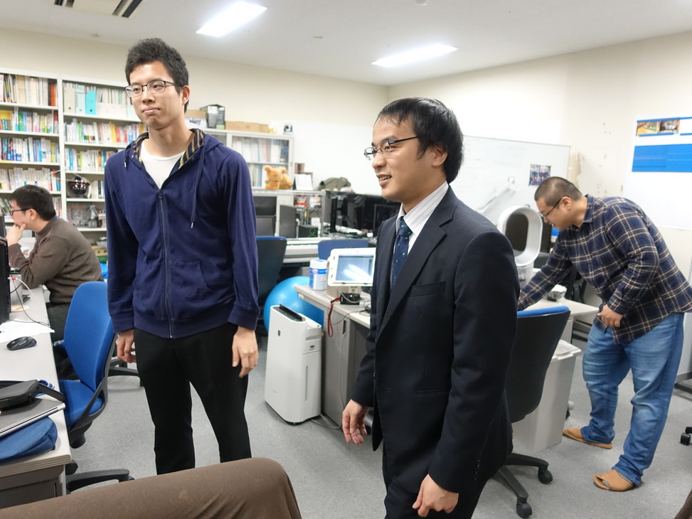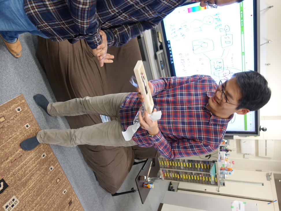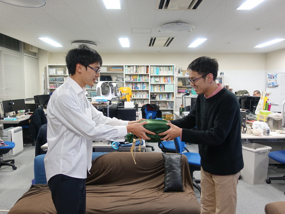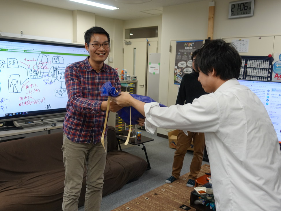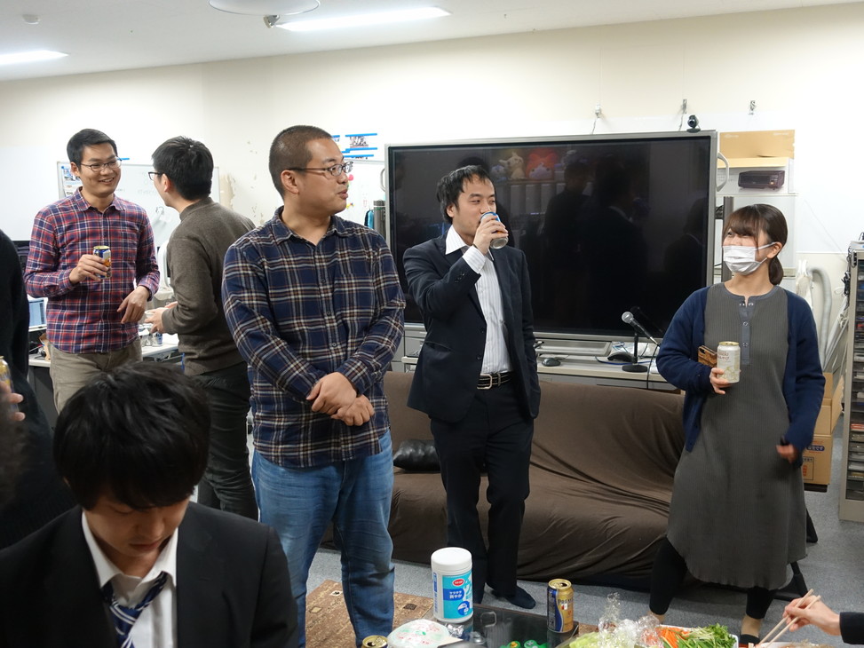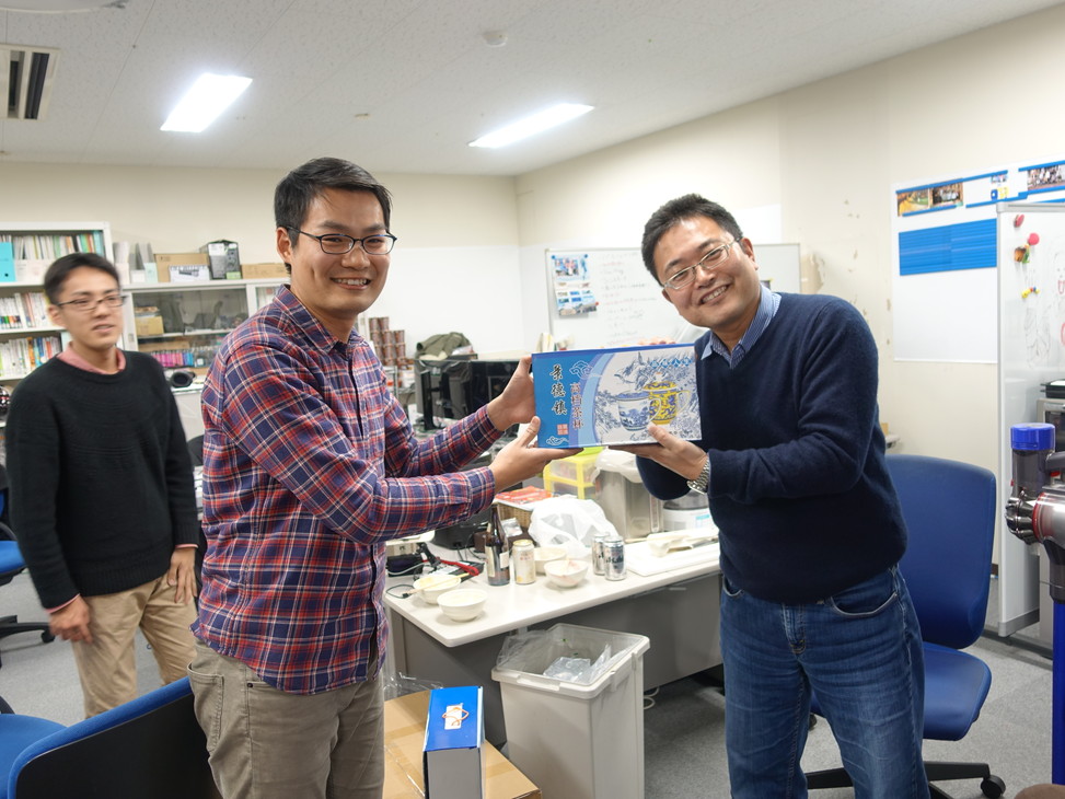 追いコン2019(平山)†報告者:平山 2019-03-04 3/1(金),今年度卒業される鈕さんと香川さんをお祝いする追いコン(追い出しコンパ)が開催されました. すき焼き,生春巻き,刺身,卵とベーコンの燻製,といった盛り沢山のメニューを作って食べました. 食べ応え抜群.というかだいぶ多かったです. 途中からは研究室OBの徳田さんにも来ていただきました. 最後は,後輩たちから先輩たちへとプレゼントを贈りました. ラーメンが好きだという香川さんへはラーメン鉢を, 近くご結婚される鈕さんへは夫婦箸と電子吸着ボードをプレゼントしました. すると先輩方からも,サプライズとして,研究室へプレゼントをしてくださいました. 香川さんからはビーズクッションを,鈕さんからは高級ティーカップセットが贈られました. 先輩方が卒業される前に,現メンバーが全員集まってパーティができ,大いに盛り上がれて楽しい1日となりました. |
