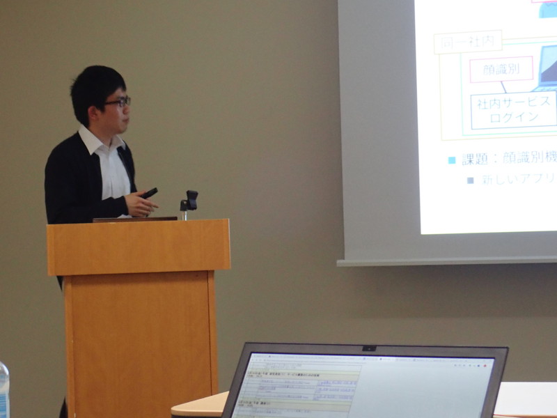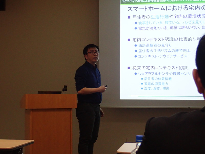 このうち陳さん,前田さん,平山が発表を行いました. タイトルは, 陳さんが“コグニティブAPIによる特徴量を用いた宅内コンテキスト認識手法の提案”, 前田さんが“エージェントによる「こころ」センシングを活用した物忘れ支援サービスの提案”, 平山が“顔識別センサボックスとバーチャルエージェントを活用したスマート出退社サービスの開発”です.