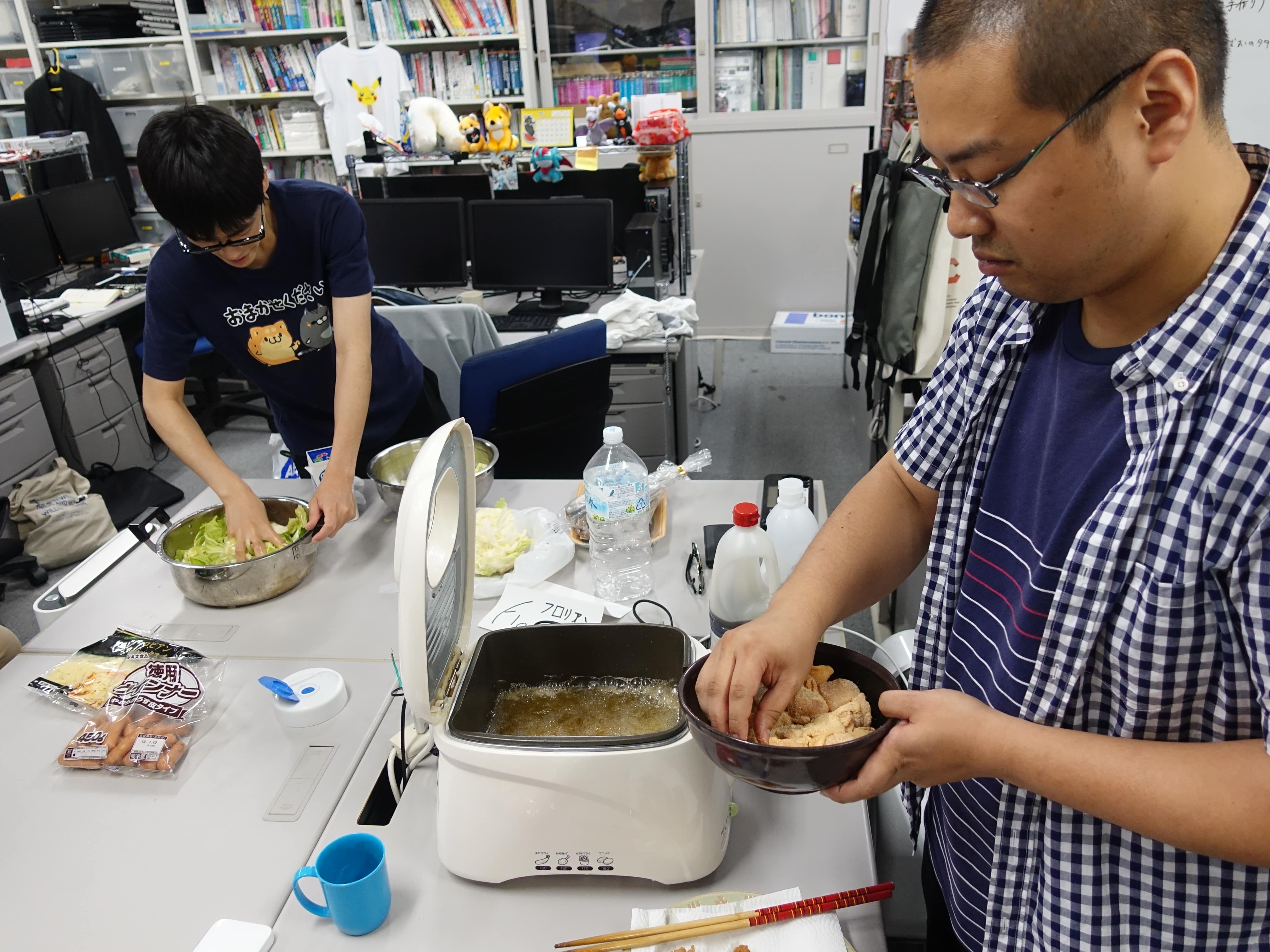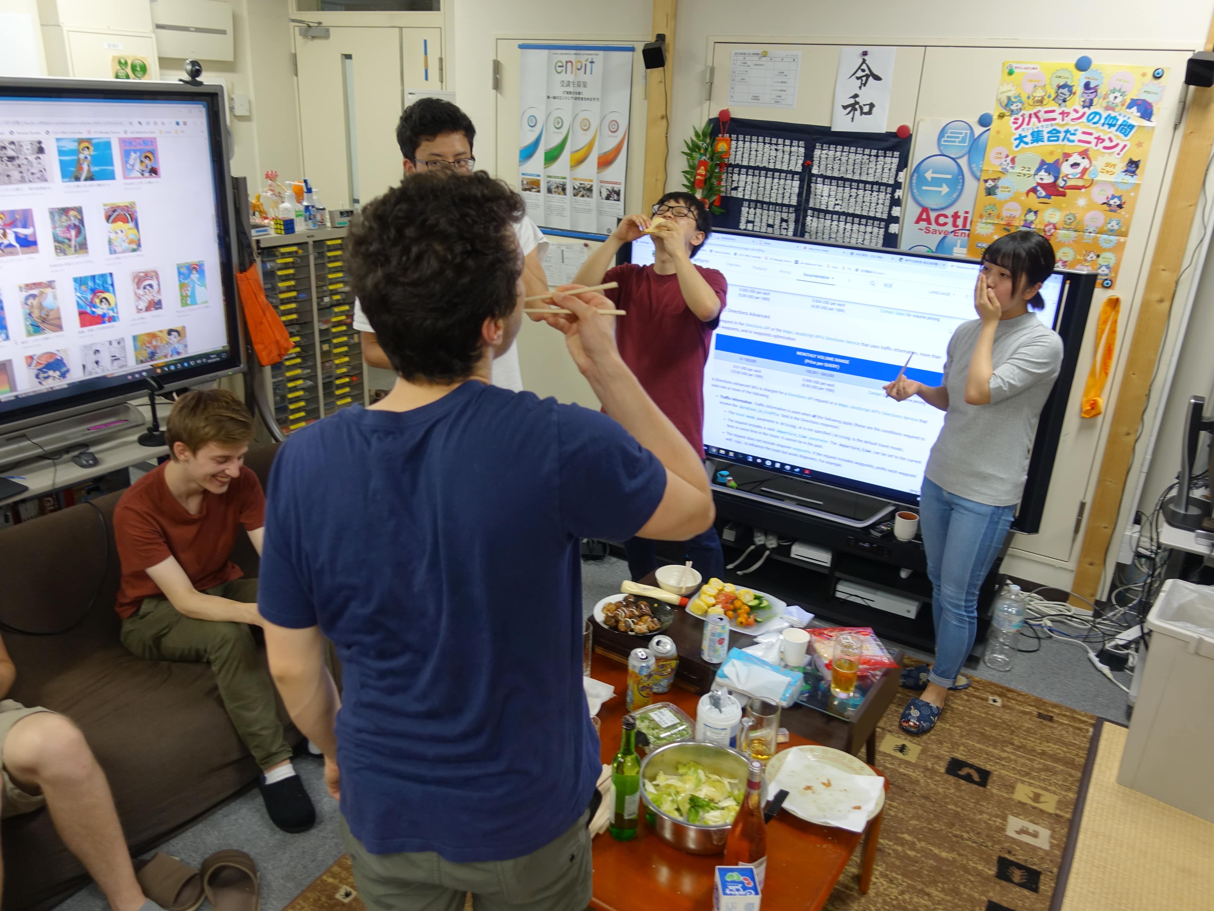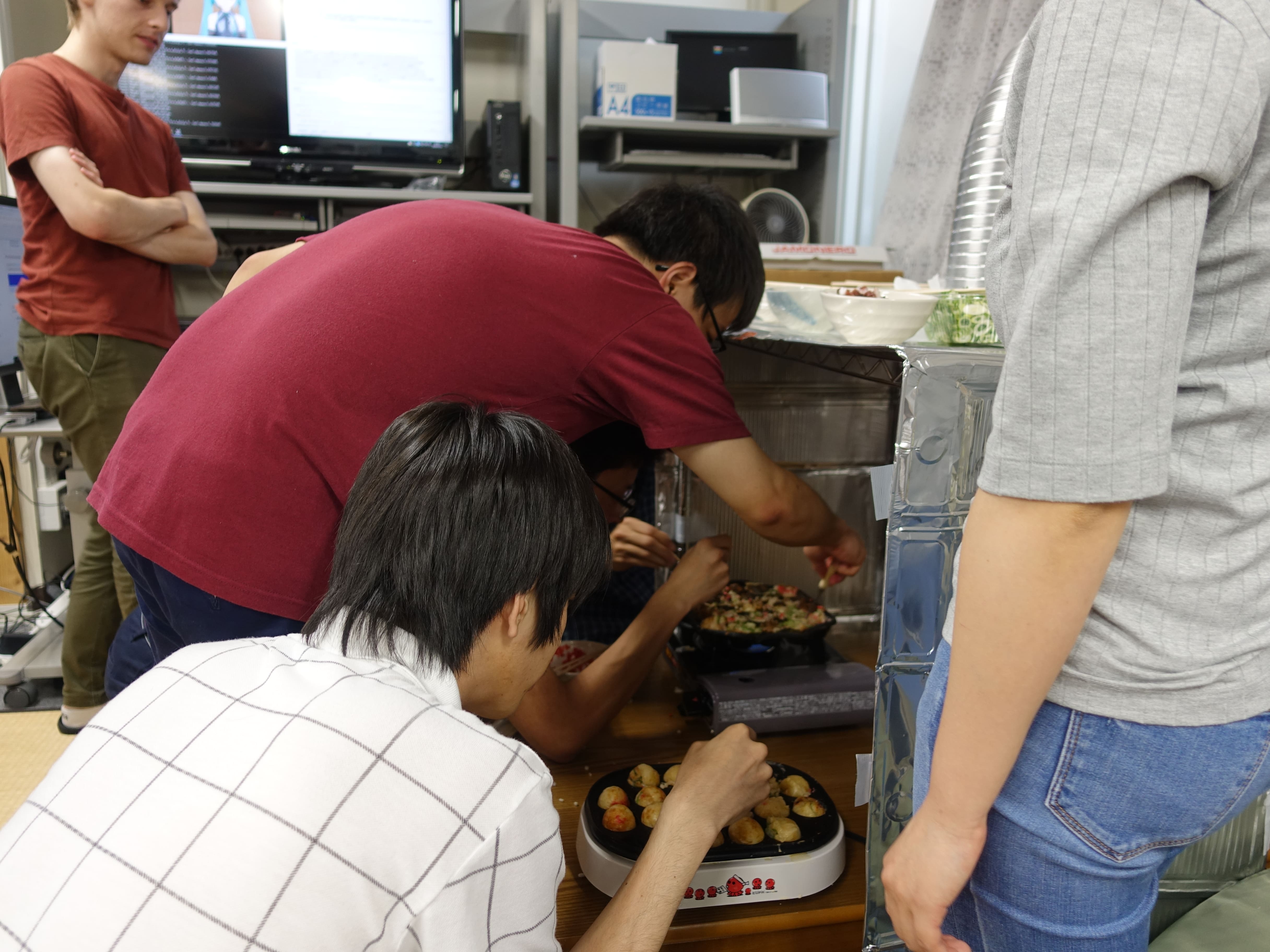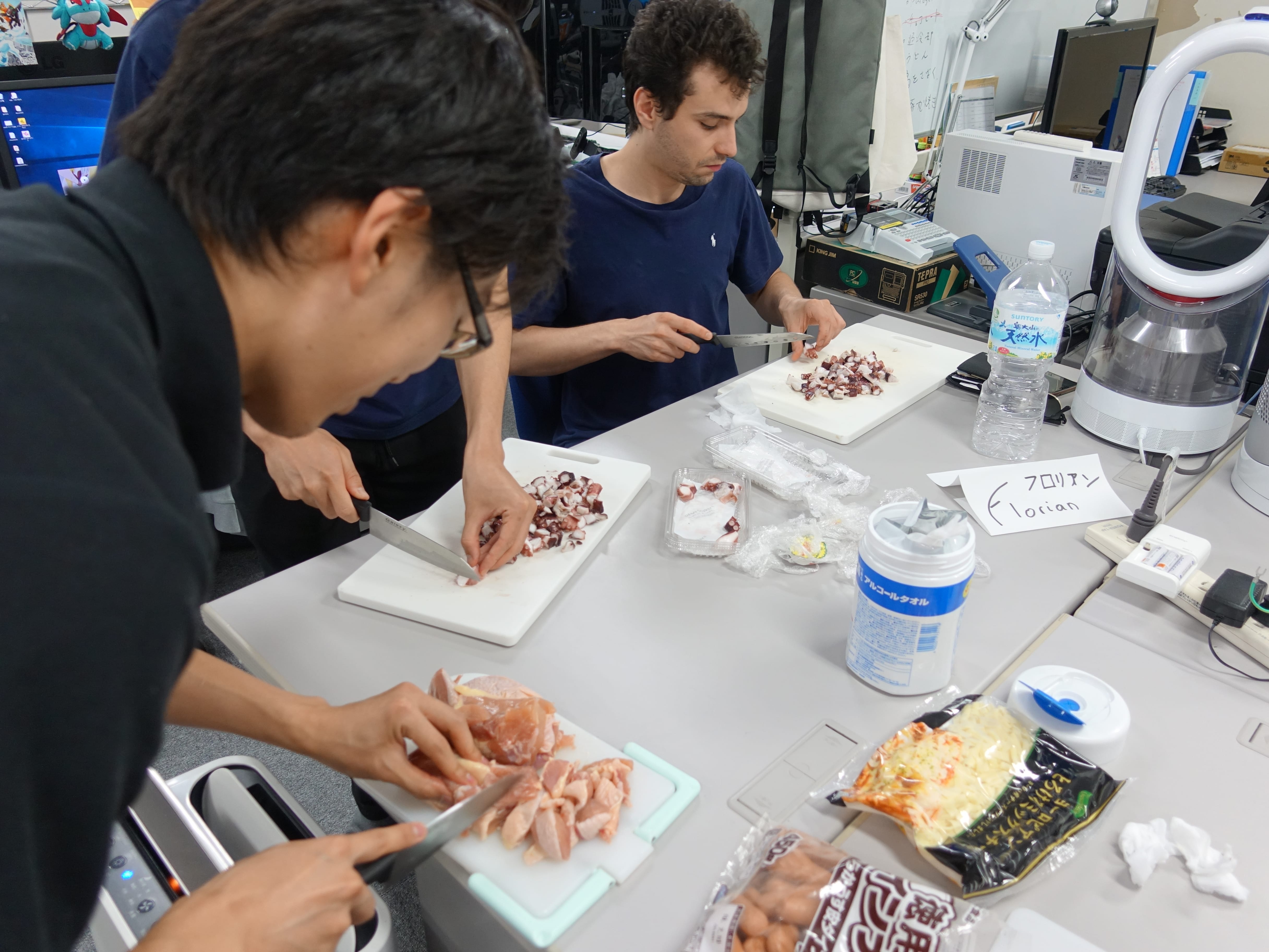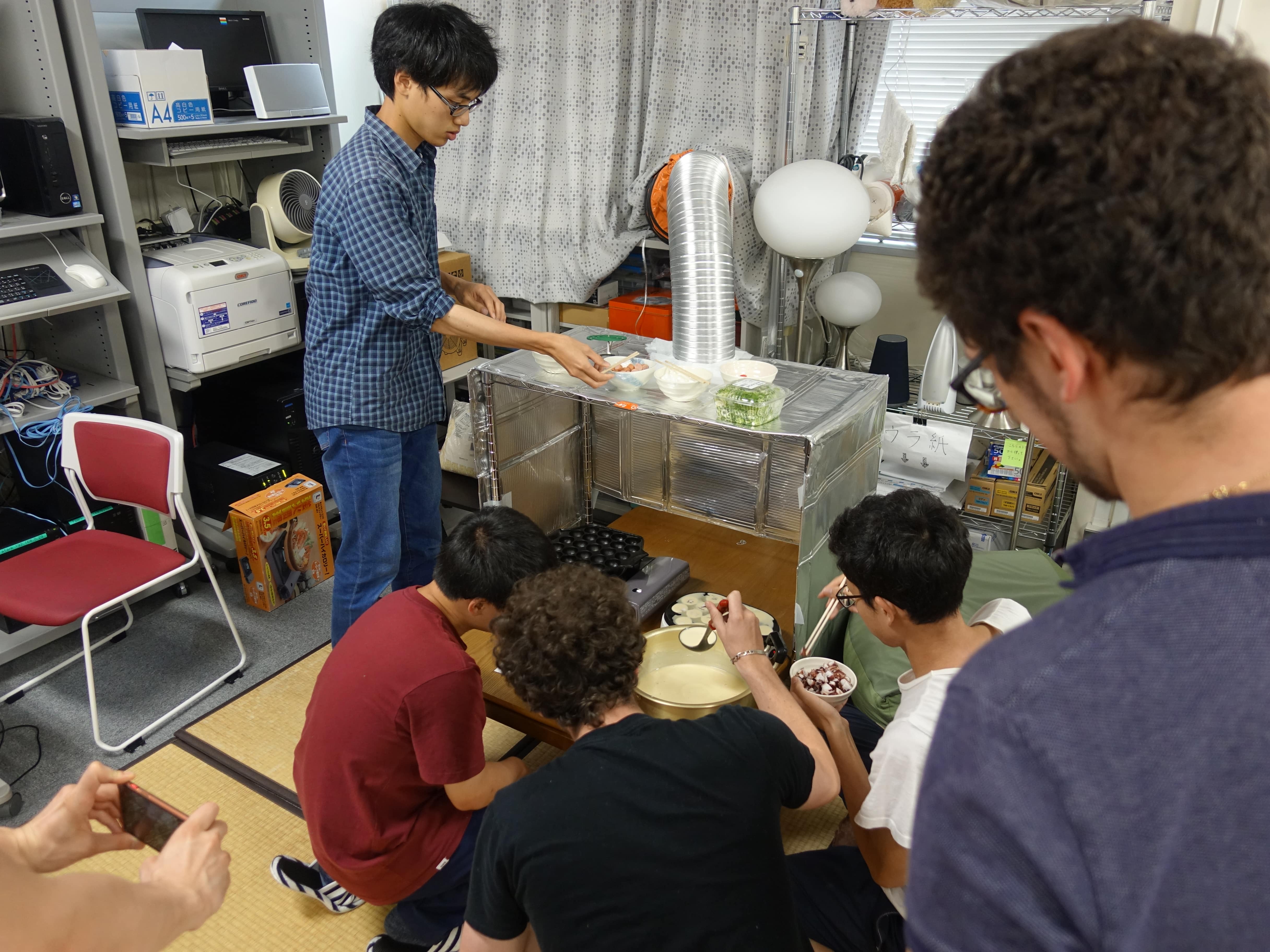 研究室たこやきパーティ†報告:徳田 2019-07-08 2019年7月5日、研究室でたこやきパーティを開きました フランス人学生達がもうすぐ帰るということもあり、盛大な宴を開くことになりました。 たこ焼きだけでなく、唐揚げやサラダ、干物など非常に色とりどりな食べ物を用意すべく、 研究室メンバー総がかりで準備を進めます。 しかし研究室で宴会をひらく際に必ず立ちふさがる匂い問題... 研究室が一階である以上逃れることができない案件です。 けれど今回はそれに立ちむかうべくこの秘密兵器を用意しました 匂いを充満させないための装置 銀アルミで囲い換気のダクトを直接つなげた空間でたこやきを焼くことで大幅に匂い問題を解消することに成功しました
