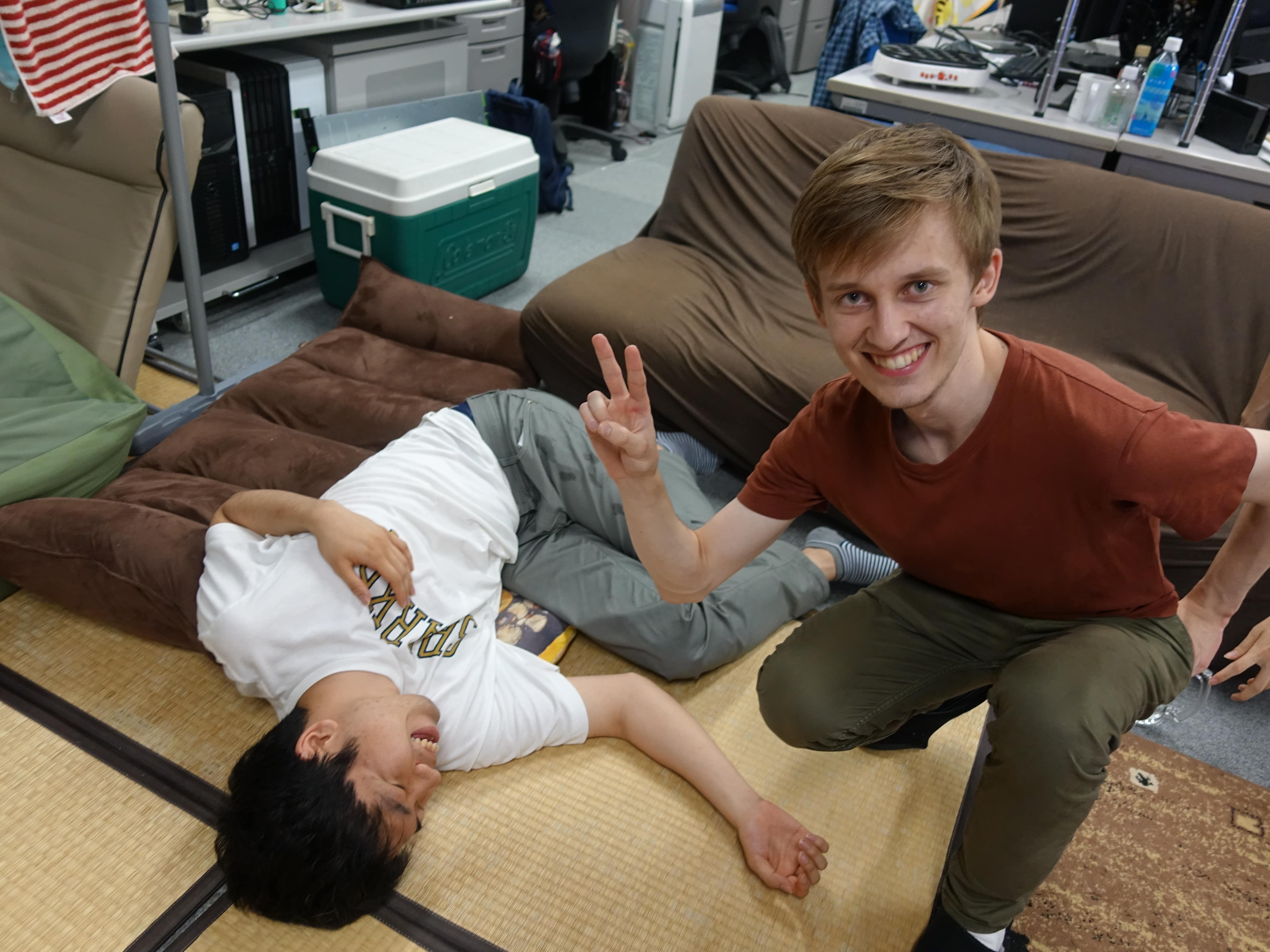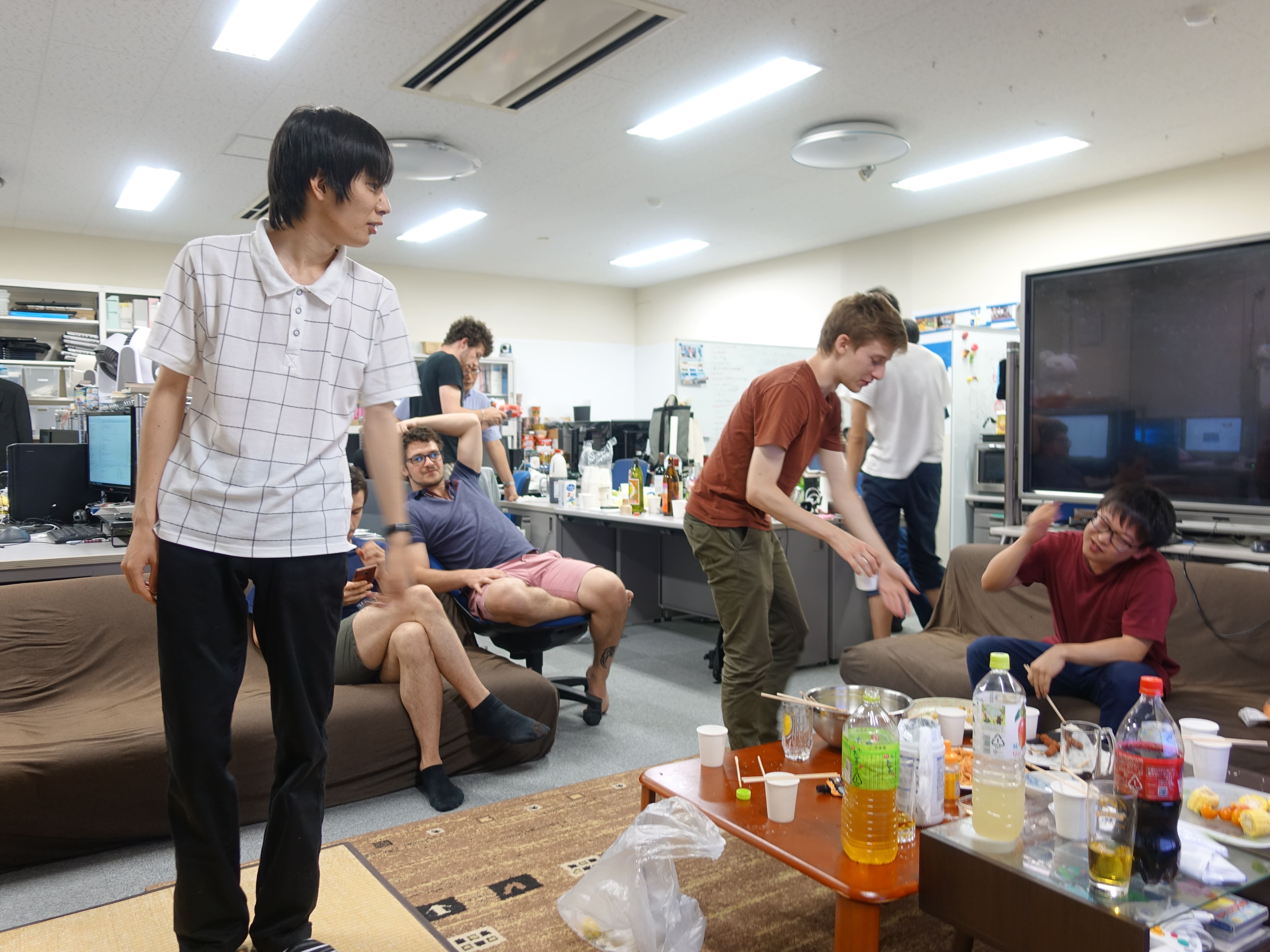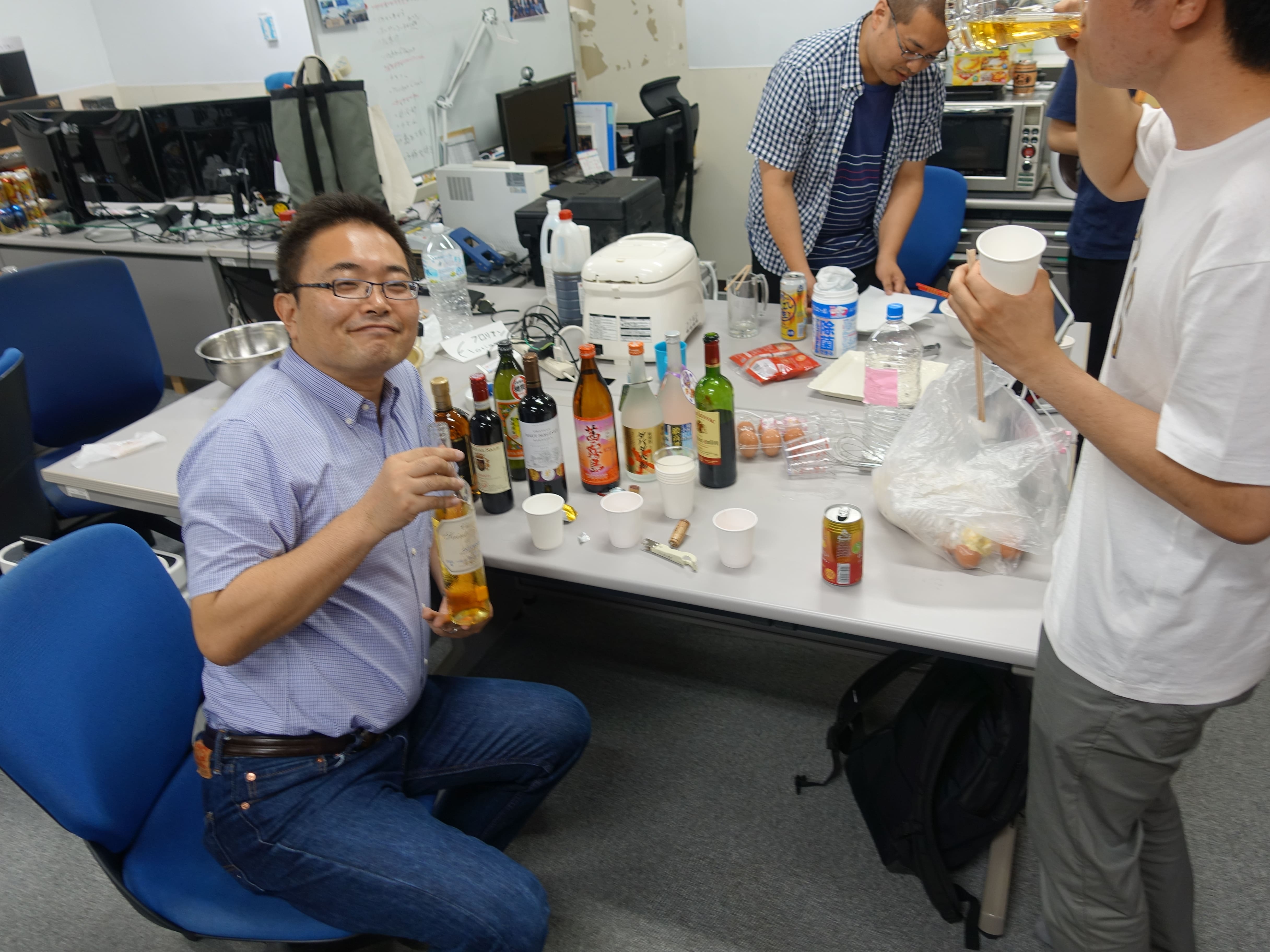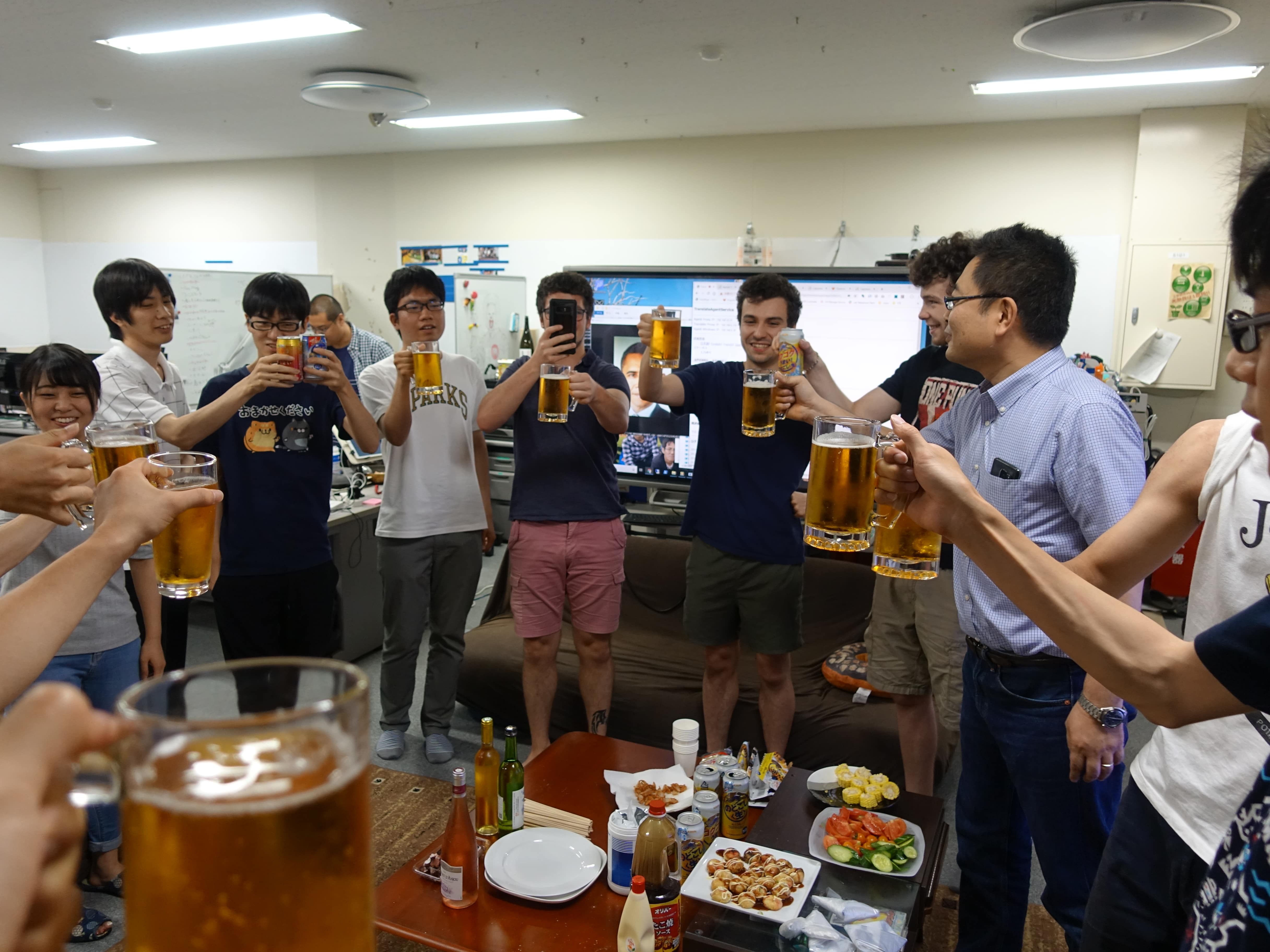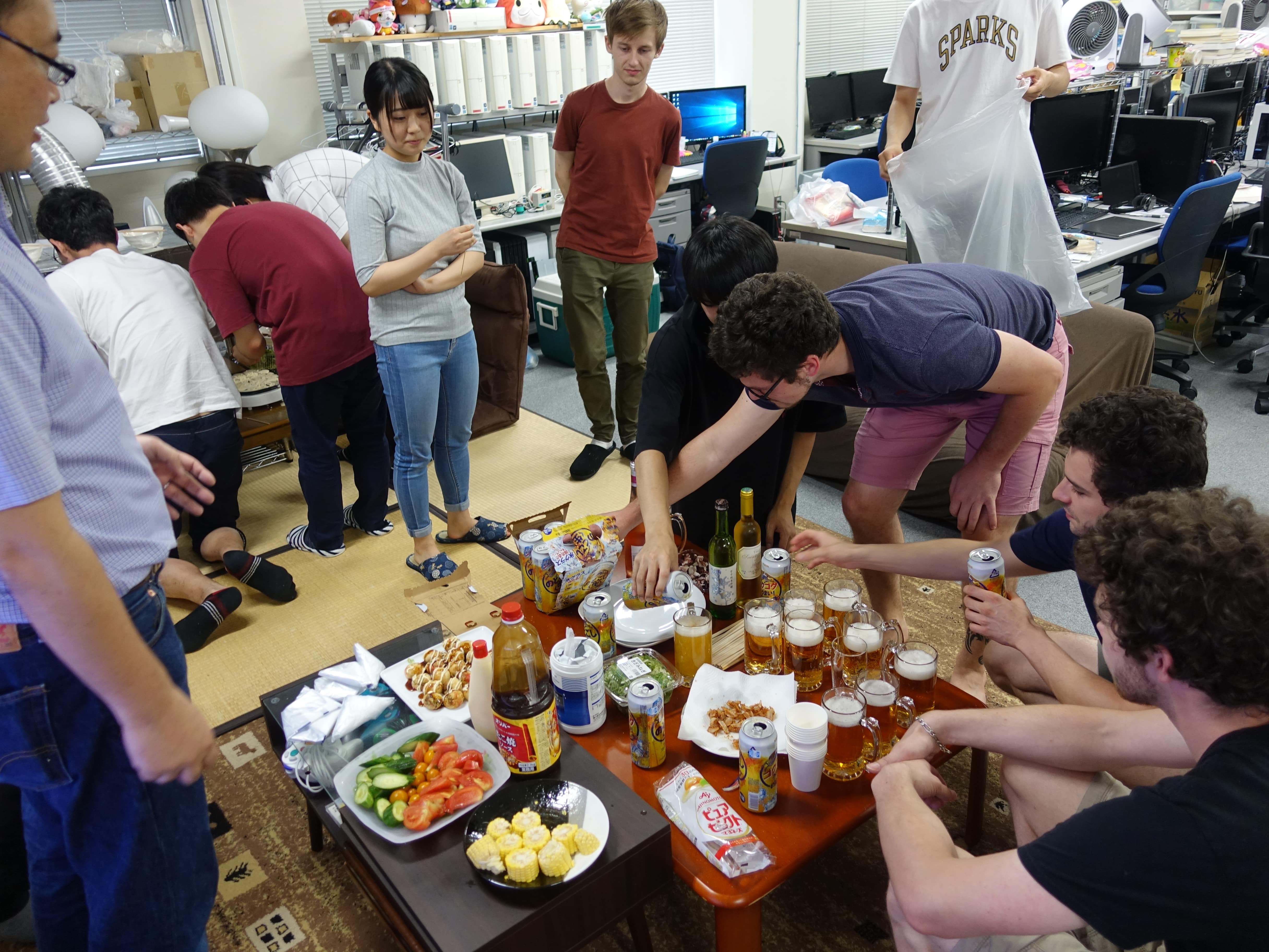 そして料理がそろっ...てはおらずまだ唐揚げやたこ焼きを焼いている途中ですがもう我慢できないとのことで、 みんなで乾杯をしました 飲みながら翻訳サービスで遊んだりたこやきでたこせんをつくったり、 またいろいろなお酒を試したりしながら、わいわいと交流を深めました。 夕方から始めて気が付けば9時10時になっており、時間を忘れて楽しい一夜を過ごしました。 |