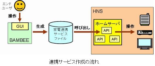 家電連携サービス作成支援システム“BAMBEE”の実装と評価†背景†近年,ネットワークを介して家庭内の家電を操作するホームネットワークシステム(HNS)が, 人々の生活をより便利で快適にすることのできる基盤技術として注目されており,家電メーカでは ネットワーク対応家電が開発されています. そのような中,我々の研究グループは独自のHNS(NAIST-HNS)を構築し,HNS内の家電を逐次操作させる 家電連携サービスという技術に関する研究を行っています.その理由としては,家電連携サービスはネットワーク家電の付加価値を 高める技術だと考えているからです. 家電連携サービスのニーズ†現在,家電連携サービスはベンダが作成し,エンドユーザは与えられたサービスを実行するという 利用スタイルになっています.しかし,エンドユーザの嗜好や生活スタイルは,家庭環境や個人ごとに 異なります.また,将来的に家電の種類が増えた場合は,自らの生活スタイルや嗜好に合わせた 家電連携サービスを,エンドユーザ自らの手で作成したいという要求が生まれることは自然です.ここで,もし エンドユーザに連携サービスを作成したいという意思が無ければ,現在の家電連携サービスの利用スタイルを 変える必要はありません.しかし,50名のエンドユーザに家電連携サービスを作成させるという予備実験を行った結果, 88%のエンドユーザが「家電連携サービスを自分で作れたら役に立つ」とアンケートで答えました. よって,エンドユーザには家電連携サービスを作成したいというニーズがあることがわかりました. 家電連携サービスの作成方法と問題点†現在,エンドユーザが家電連携サービスを作成する方法としては,いくつか考えられます.一つ目は プログラムによる方法,二つ目は学習リモコンを用いる方法です.しかし,これらの方法では プログラミングに関する知識や煩雑な作業が必要であるため,エンドユーザにとっては困難だという 問題点があります. アプローチ†本研究では,GUIを用いたビジュアルプログラミングにより,エンドユーザが家電連携サービスを 作成することのできるシステム(BAMBEE)を提案します.具体的には,エンドユーザが 家電連携サービスの作成・編集・削除を行えるようにするという目的を果たすため,提案システムに 必要な6つの要件を定義し,その要件を満たすように実装を行いました. 6つの要件は以下のようなものです.