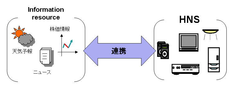 よって、家庭内の機器のみの枠にとらわれず、 Web上の情報資源と連携することによりHNSサービスの付加価値を高めることが期待されます。 Web上の情報資源との連携ってどういうこと?†Web上の情報資源とHNSが連携することでよりうれしいサービスが提供されます。例えば…