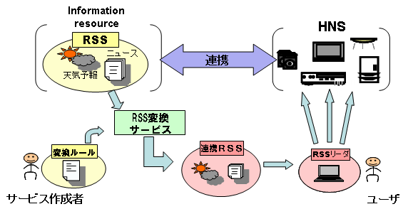 RSSを利用したWeb上の情報資源とホームネットワークシステムとの連携†背景と問題点†ホームネットワークシステム(HNS)では、宅内外から家電機器を遠隔制御・監視したり、機器を連携制御するといったサービスが提供されます。しかし、これらのHNSにおけるサービスはこれまで宅内の家電やセンサのみを対象とするものが主流でした。