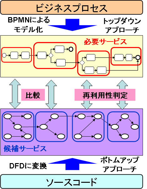 ということに関心が集まっています. 再利用するべきか新規構築か?†レガシーシステムをSOA 化する場合には,当然のことながら, 既存システムを最大限再利用し,できるだけ開発コストを節約 したいというニーズがあります. しかしながら,レガシーシステムは長年の運用・保守の過程で 変更が繰り返され,保守性が大きく低下していることが多いのが実状です. そのため,既存システムから,現行の業務(要素プロセス)と完全にマッチした 処理をうまくサービスとして切り出すことは非常に難しい問題です. こうした状況の下,経営者はシステムのSOA化に向けて既存システムを 再利用すべきか,新しくシステムを構築しなおすべきか,意思決定する 必要があります.この重大な意思決定に対して,現状では特に有効な 手立てはありません.つまり,「既存システムのSOA 化しやすさ」を評価する 尺度が存在しないのです. レガシーシステムのSOA再利用性評価†そこで本研究では,この判断を支援するために,レガシーシ ステムをSOA 化する場合の再利用性を性質付ける新たな評価尺度 (メトリクス)と,そのメトリクスの計測手法を提案します. 具体的には,まずビジネスプロセスを一般的なSOA 設計に 基づいてトップダウンに分析し,現行で必要な業務機能を, サービスという単位で抽出します(必要サービスと呼ぶ). ビジネスプロセスはBPMNでモデル化されます. 次に,我々の先行研究で提案する手法を用いて,レガシーシステム のソースコードを分析し,サービスとして成立しうる機能群を ボトムアップに抽出します(候補サービスと呼ぶ). 候補サービスの抽出には,DFD(データフローダイアグラム)が用いられます. その後,必要サービスと候補サービスとを機能面からつき合わせ,必要サ ービスの実現に現存の候補サービスがどれだけ再利用可能かを 分析します. 候補サービスを必要サービスとして再利用する†抽出された候補サービスscが,必要サービスsnの実現に 再利用可能であるとはどういうことか,我々は以下のように定義しました.