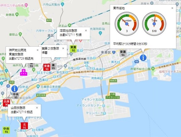 救急出動記録の時空間情報への変換による救急車の動態可視化†背景†近年、高齢化の影響で救急隊の出動要請は年々増加し続けています。 しかし、自治体の財政などの問題で、救急隊を大幅に拡充することは見込めません。 よって、増え続ける要請に対し、限られた救急隊のリソースをいかに効率よく割り当てるかが重要です。 そのためには、不備の救急要請や出動記録を分析し、時間によって変化する需要や出動の実態をきちんと把握する必要があります。 課題†最近の消防局では、最新のICTシステムを用いて、消防や救急の様々なデータを記録、管理する取り組みが始まっています。 しかし、ここで蓄積されたデータを分析するには相当なデータ分析スキルが必要となるので、消防局職員自らが現状の業務の合間に分析を行うのは非常に困難です。 目的とアプローチ†こうした問題を解決するため、データ分析の専門知識を持たない人でも手軽に過去の救急車の動態を把握できるように、ADR(Ambulance Dispatch Reviewer)を開発しました。 ADRは、蓄積されたデータをもとに、過去の任意の時刻での救急所の位置と動態を算出し、地図上にわかりやすく可視化するアプリです。 ADRは、大きく分けて2つのアプローチからなります。 一つ目は、救急出動記録の時空間情報への変換。 二つ目は、時空間情報の可視化です。 これらを行い、実際に神戸市消防局の過去6年間、約46万件のデータを入力して、可視化を行いました。 発表文献†矢吹 直也, 香川 拓大, 佐伯 幸郎, 中村 匡秀, 内藤 真貴子, ``救急出動記録の時空間情報への変換による救急車の動態可視化,'' 電子情報通信学会技術研究報告, vol. 118, no. 485, LOIS2018-70, pp. 85-90, 2019年3月. |