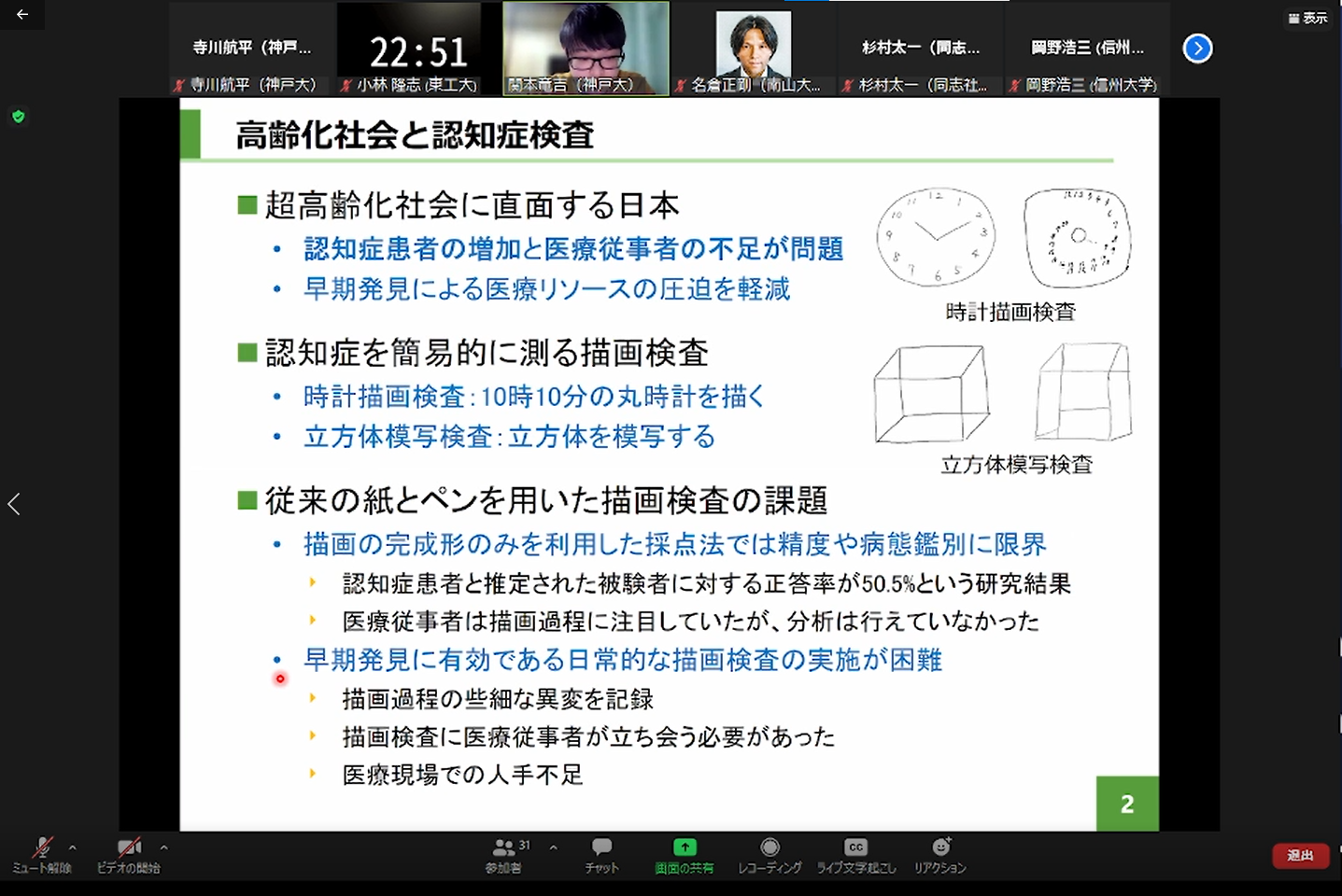 寺川,中井は研究室から、関本は自宅からオンラインで参加しました。