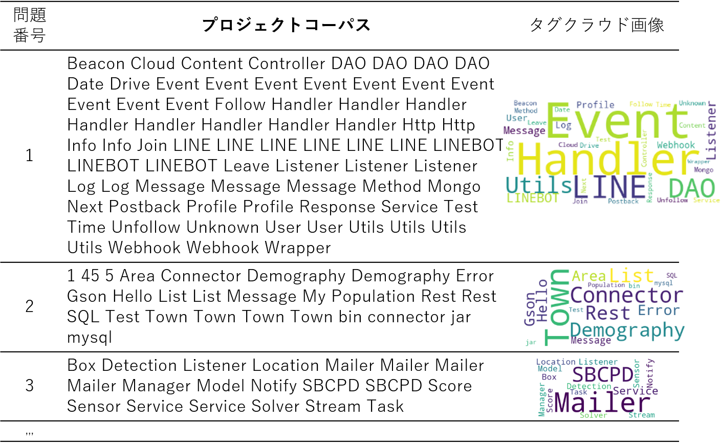(Step1)リポジトリマイニング: Step1 では,リポジトリマイニングによってクラス名を抽出する (Step2) プロジェクトコーパスの作成: Step2 では,Step1 で取得した各クラス名を単語に分割する.分割処理によって得られた単語群を,そのプロジェクトに関するプロジェクトコーパスと見なす. (Step3) プロジェクトコーパスの加工: プロジェクトコーパスを辞書順に並び替え,タグクラウド画像を生成する (Step4) 概要の推測: プロジェクトコーパスのみを参照して生成元のプロジェクトのもつ機能,使用技術,概要を推測する