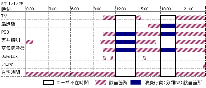 しかし,グラフの解釈はユーザ自身にゆだねられる為に,浪費行動となる箇所を発見することが困難であるだけでなく,ユーザの省エネ意識の高さにも左右される.