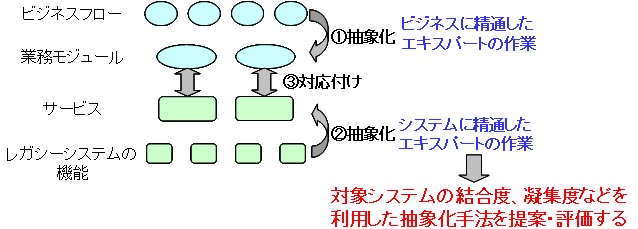 SOAに基づくシステム開発では,まずビジネス環境を分析して要素プロセスを決定した後,これらの要素プロセスに合わせて,システム機能をサービスとしてマッピングする,トップダウンなアプローチが知られています.しかしながら,レガシーシステムには,長年の保守による保守性の低下や,変更による業務への影響が認められない,などの問題があります.したがって,ビジネス環境に合わせた大幅な修正を行うことが困難になっています. 従って,レガシーシステムをSOA化する際には,既存システムの機能を最大限再利用することを考慮して,ビジネスの要素プロセスを決定する,ボトムアップなアプローチも考慮に入れる必要があります.