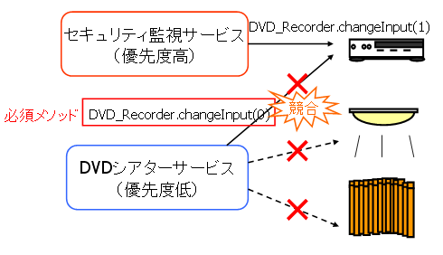 必須メソッドを導入することで,「DVDシアターサービス実行時に競合が発生し,DVDレコーダーが制御できないためにDVDを視聴できないにもかかわらず照明やカーテンの制御を行う」といった,サービスが成立しない場合の無意味な機器制御を省くことができます.