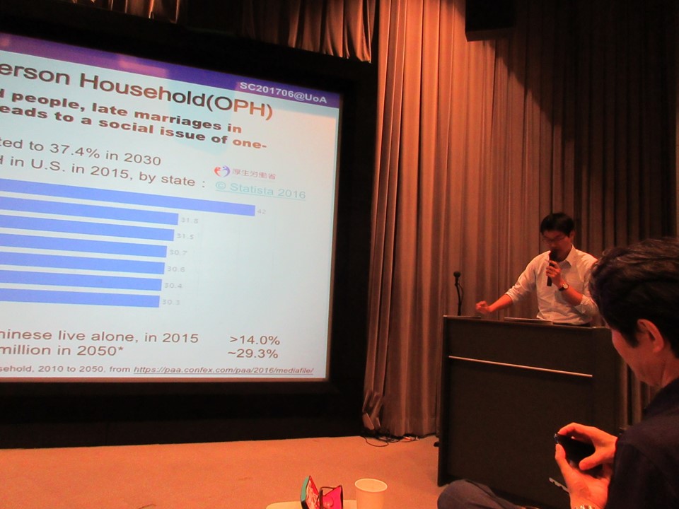 私の発表タイトルは「Analyzing Indoor Environment Sensing Data for Recognizing ADLs of One Person Household」でした.屋内の環境センシングデータを用いた独居者の生活行動の検出手法について,30分ぐらい話しました.