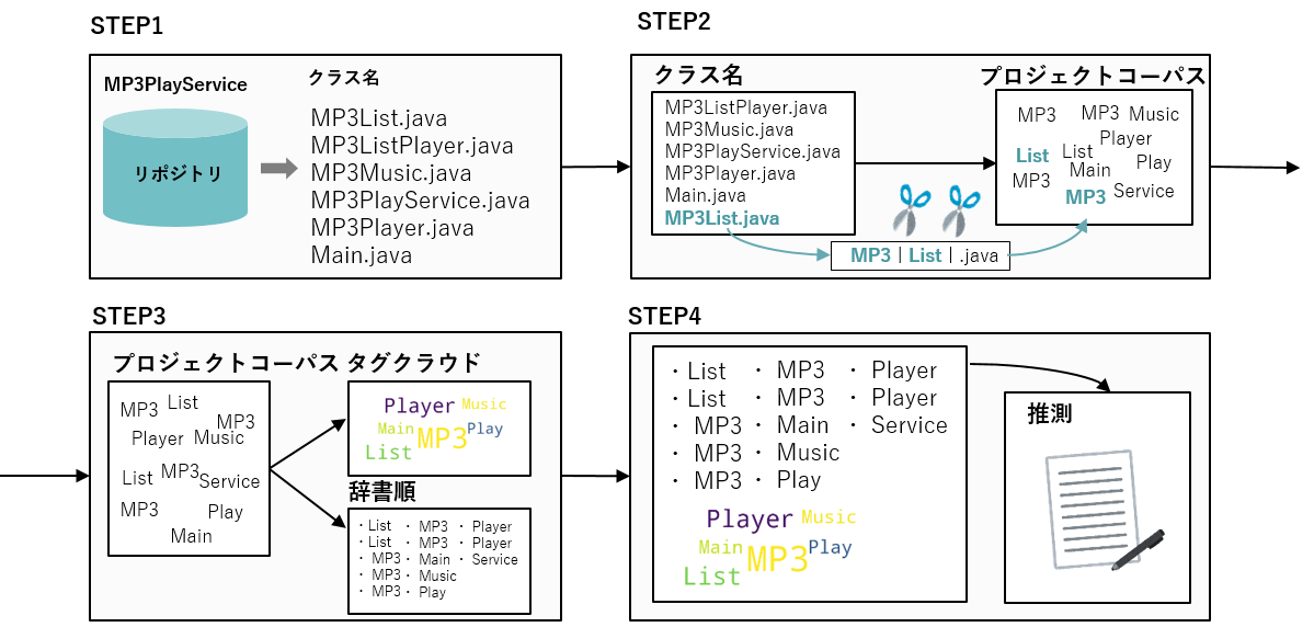 (Step1)リポジトリマイニング: Step1 では,リポジトリマイニングによってクラス名を抽出する (Step2) プロジェクトコーパスの作成: Step2 では,Step1 で取得した各クラス名を単語に分割する.分割処理によって得られた単語群を,そのプロジェクトに関するプロジェクトコーパスと見なす. (Step3) プロジェクトコーパスの加工: プロジェクトコーパスを辞書順に並び替え,タグクラウド画像を生成する (Step4) 概要の推測: プロジェクトコーパスのみを参照して生成元のプロジェクトのもつ機能,使用技術,概要を推測する