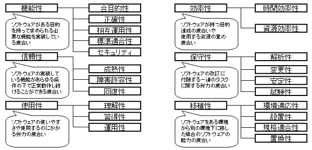 従来のソフトウェア資源の品質については、ISO/IEC9126において「ソフトウェアの品質特性」として定義されています。
