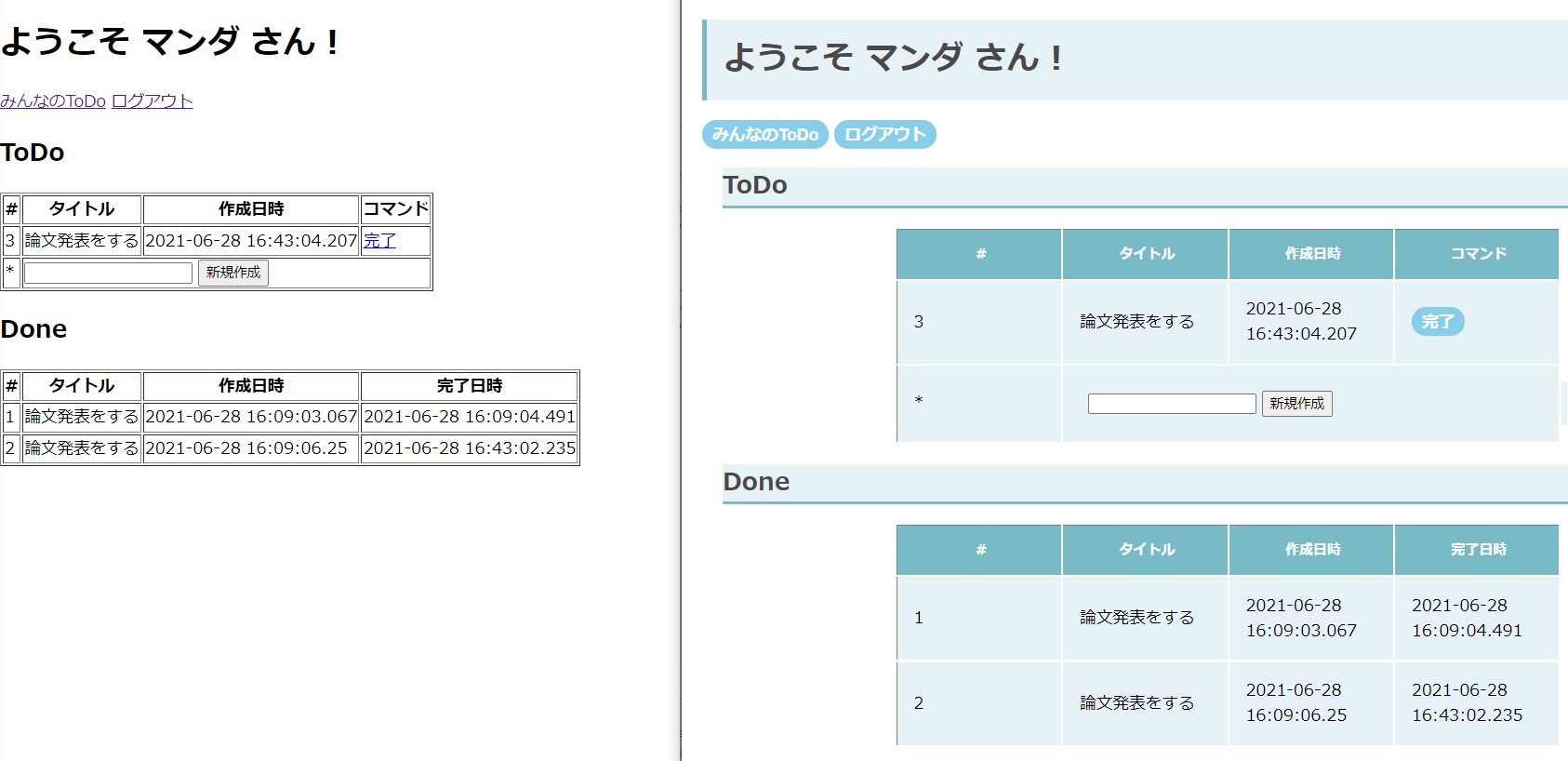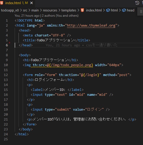 <link rel="stylesheet" th:href=@{/css/todo_css.css} />Bootstrapはレスポンシブデザインに対応したフロントエンドのフレームワークだよ。 シンプルな指示でグリッドシステムを使用できたり、本格的なフォームやボタンを作成できたりと非常に便利なんだ。
