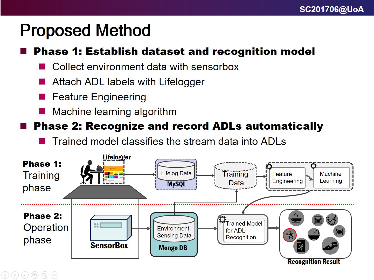 私の発表タイトルは「Analyzing Indoor Environment Sensing Data for Recognizing ADLs of One Person Household」でした.屋内の環境センシングデータを用いた独居者の生活行動の検出手法について,30分ぐらい話しました.