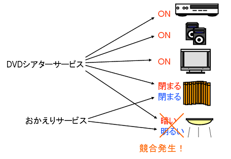 これらを同時に実行すると、照明に対する機能の衝突、いわゆるサービス競合が起きます.