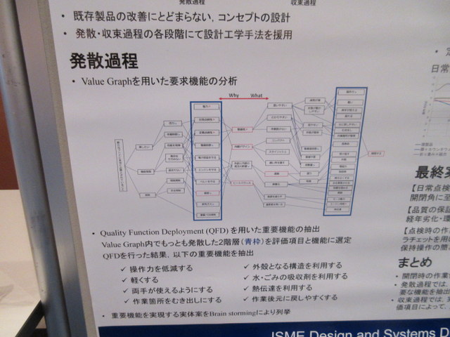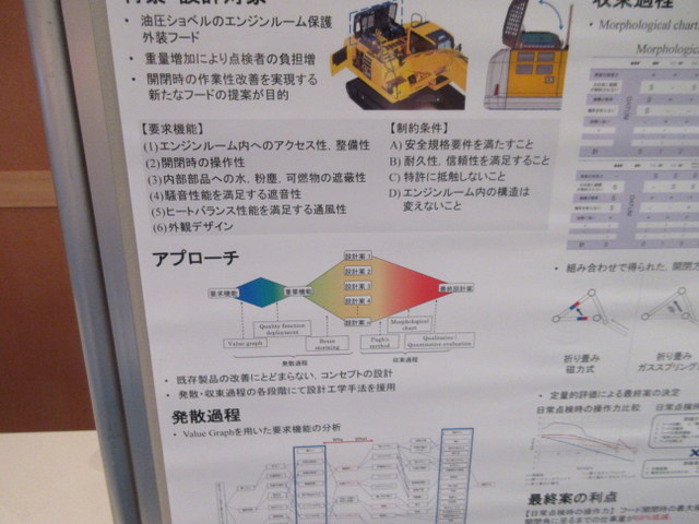 D&Sコンテストというポスターセッションもありました.阪大の学生さんのポスター. Quality Function Deploymentという発想法を活用した重機のエンジンカバー設計の発表.