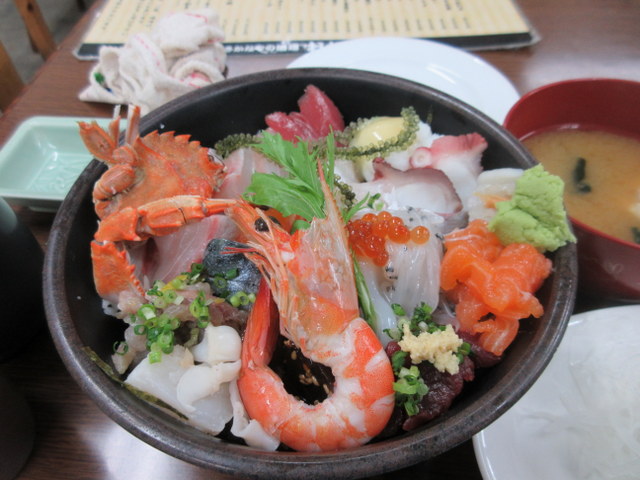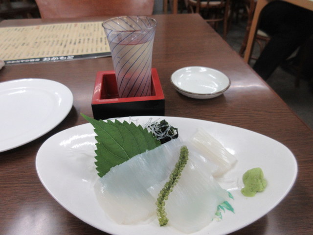 おまけ.下関のおかもと鮮魚店で食べた海鮮丼.これで1080円(税込)でした.イカの刺身と山口の酒「獺祭(だっさい)」もいただきました.サイコーです!