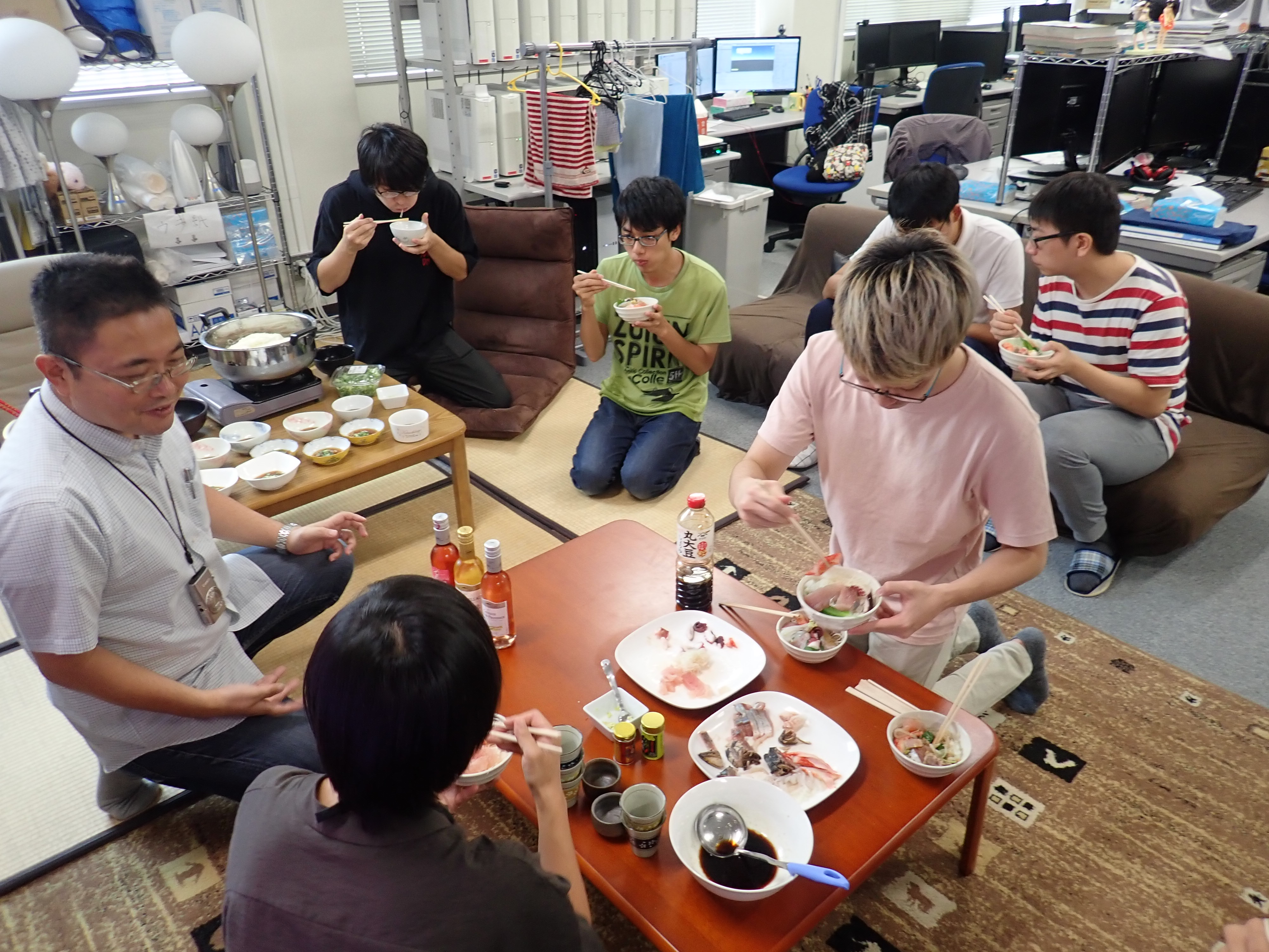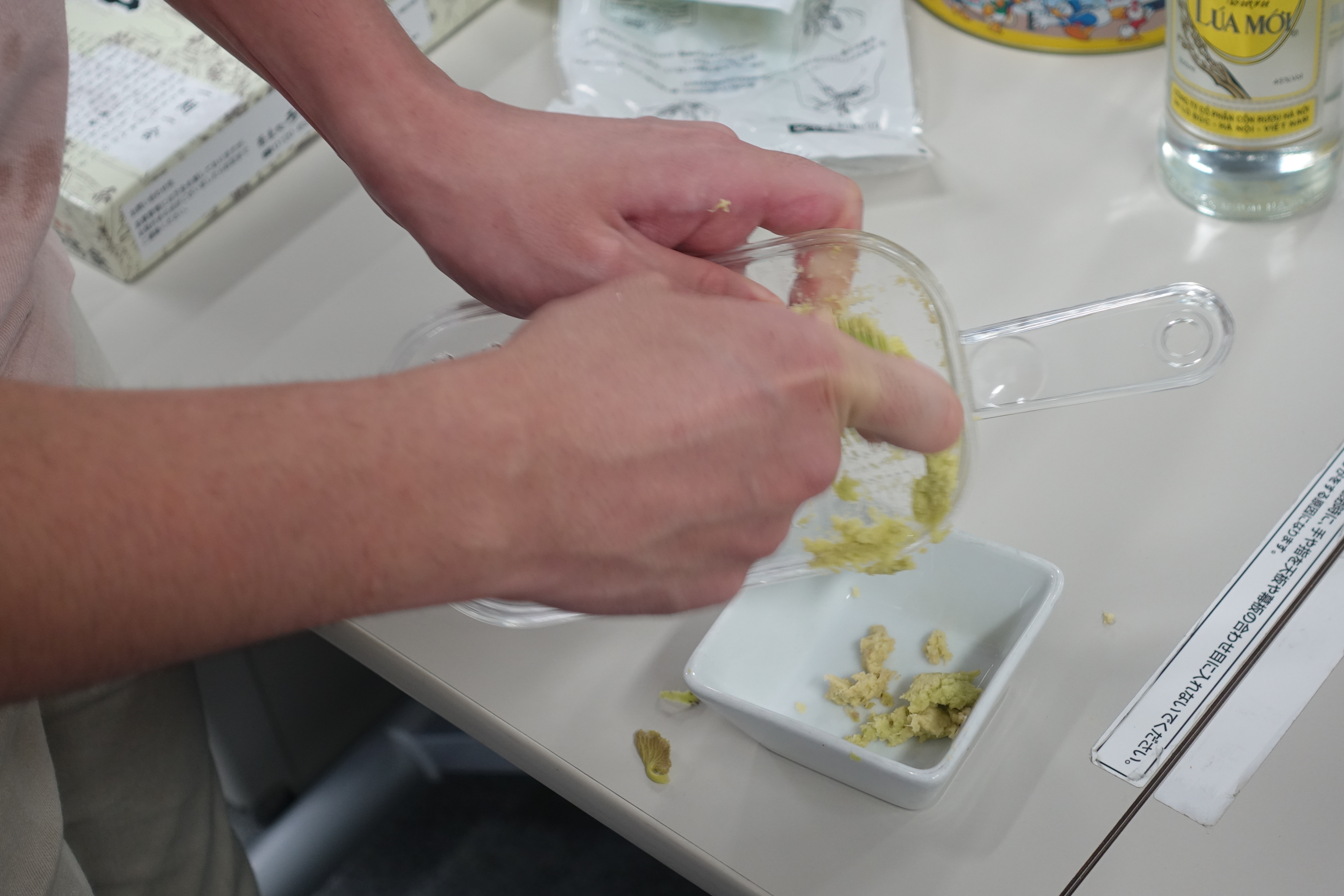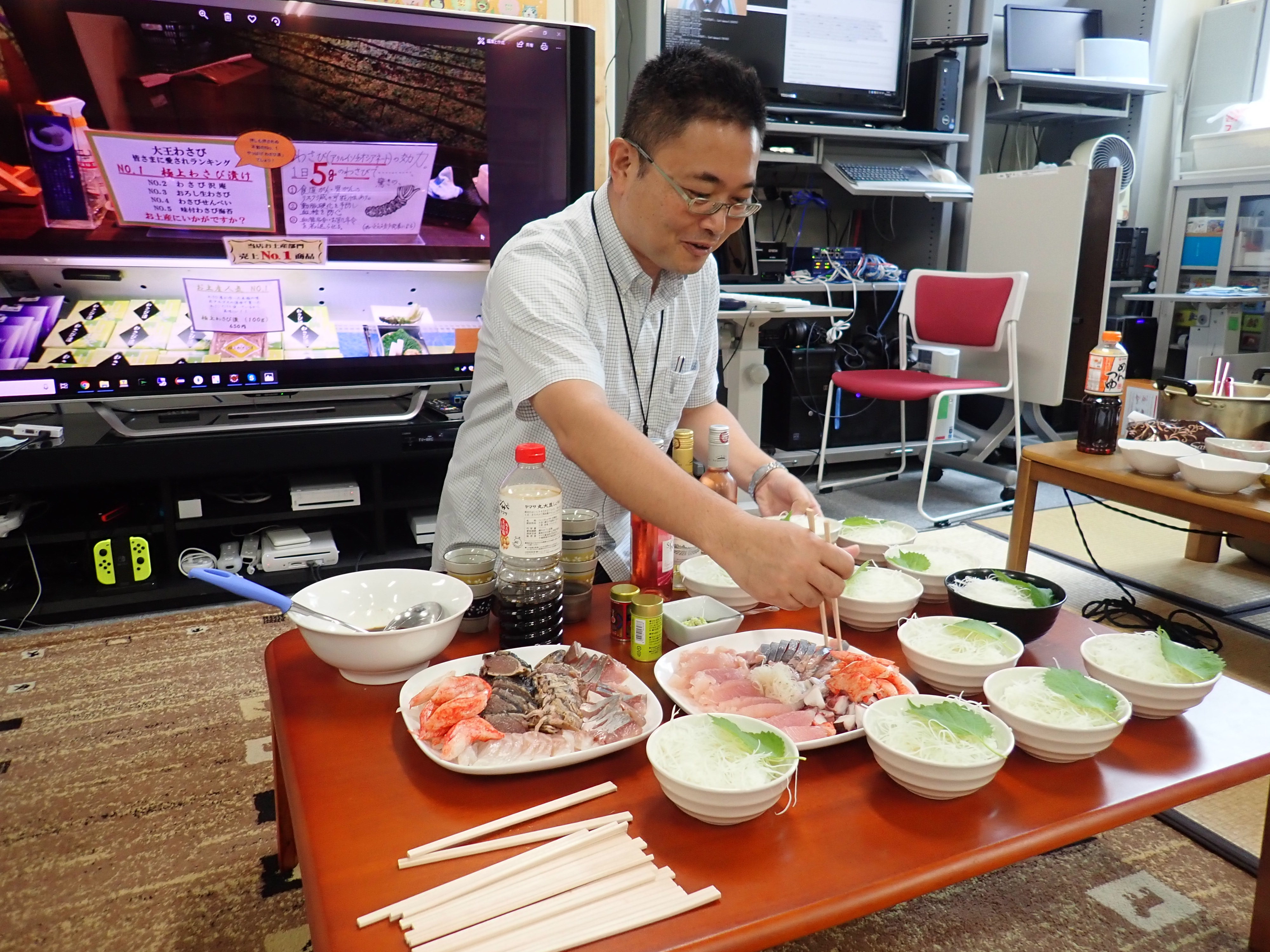 今回は海鮮丼とそうめんにあわせていただきました.その他に中村先生が用意してくださったワインも楽しませていただきました. わさび自体は辛みが強すぎず,やさしい口あたりなので風味を楽しみやすいものとなっていました.