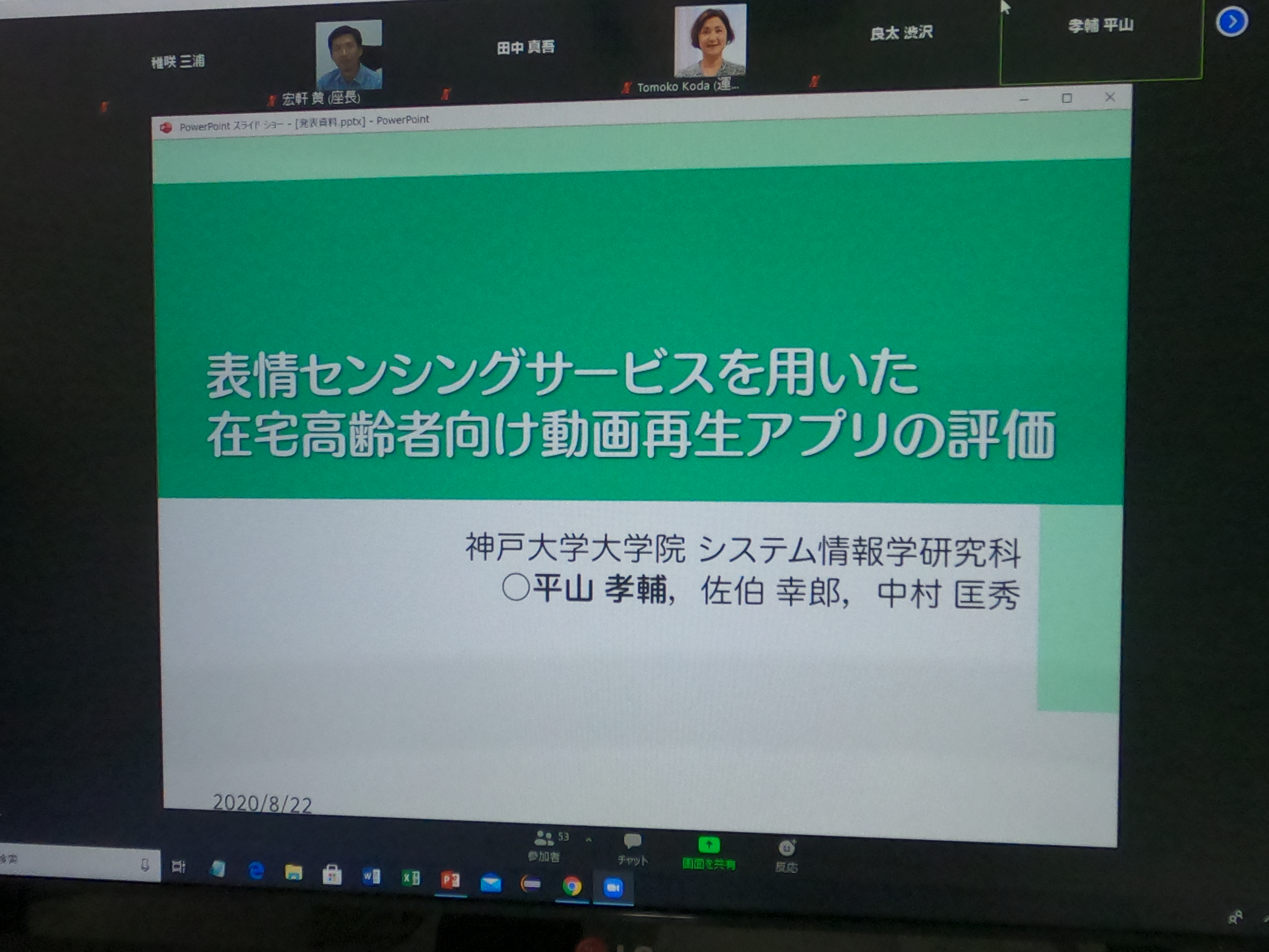 平山くんは自宅から研究会に参加していたため,発表中の写真は撮れなかったのですが,