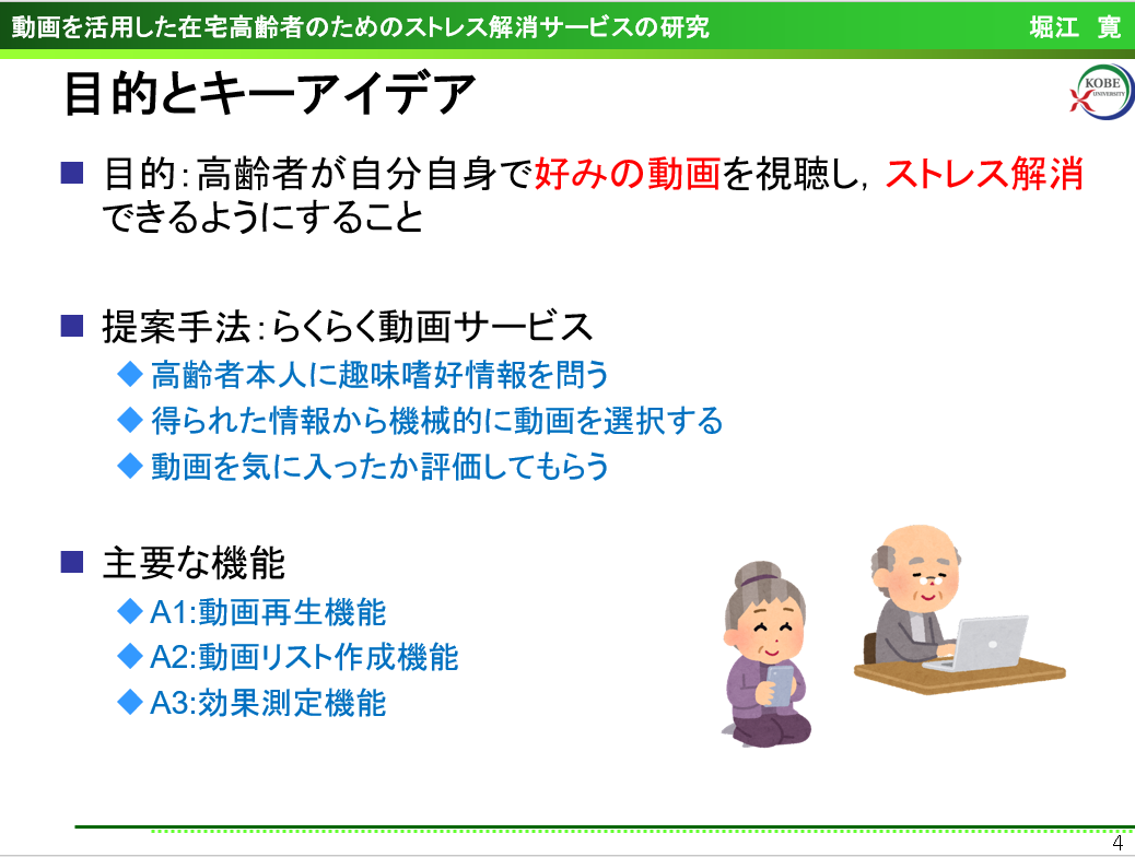 2022年2月27日~28日に開催されたヒューマン情報処理(HIP)研究会に堀江が参加しました. 今回は新型コロナウイルス感染症拡大防止のため,オンラインでの開催でした. 「動画を活用した在宅高齢者のためのストレス解消サービスの研究」という題目で発表を行いました.