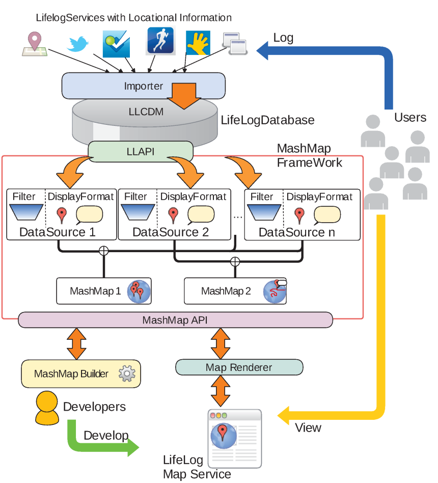 MashMapフレームワークは,様々な形式の位置付きライフログを,我々の研究グループで提案しているライフログ標準データモデル(LLCDM)形式に変換してデータベースに蓄積します.