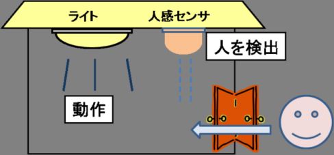 例えば,ホームネットワークシステムやビル管理システムでは,センサと組み合わせて動作することを前提とした機器が数多く運用されています.人感センサを利用し,人が近くに来るとライトをつけるセンサライト,人が近づくとドアを開ける自動ドアや,温度センサを利用して空調を適度に保つエアコンの自動運転制御,手をかざすことで水道の蛇口が開く自動水栓(automatic sensor faucet)などが存在します.