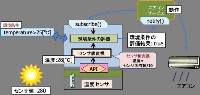 - 問題2に対しては,サービスを駆動するための条件がセンサの示す値の閾値から構成されるケースが多いことに着目し(例えば温度計の場合,温度が27度以上になったら冷房の電源を入れるなど),この種の条件判定をアプリケーションではなく各センサのサービスレイヤに委譲する仕組みを作成しました.